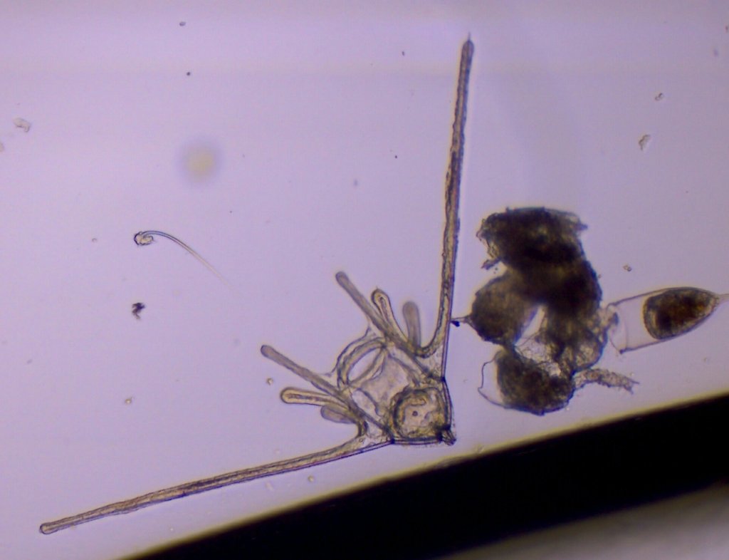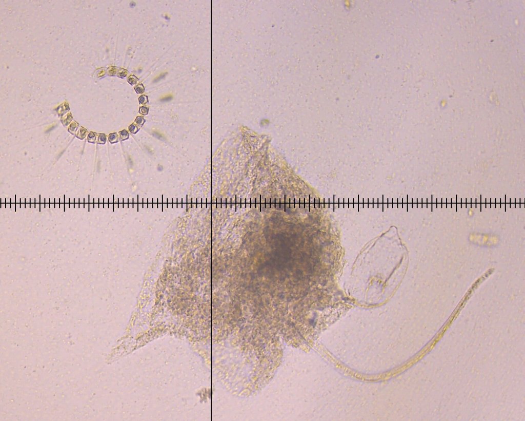 Plankton are drifters in the ocean and range in size from microscopically tiny to the biggest jellyfish. We’ve collected ours with a plankton net with a mesh size of 1/10 mm and got a wide variety of marine algae (phytoplankton, mainly diatoms and dinoflagellates), tiny animals that graze on algae and slightly larger animals that eat the smaller animals (zooplankton).
