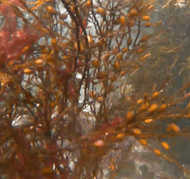 Within Lulworth Cove, at around 2.5 m depth, a different picture emerged: a dense and highly diverse habitat of kelp, seaweeds, sponges and coralline algae covered a substrate of coarse sand and boulders fallen from the cliffs above. The odd fish flitted across the camera lens. Hydroids cover kelp fronds swaying with the swell – every surface occupied by life.